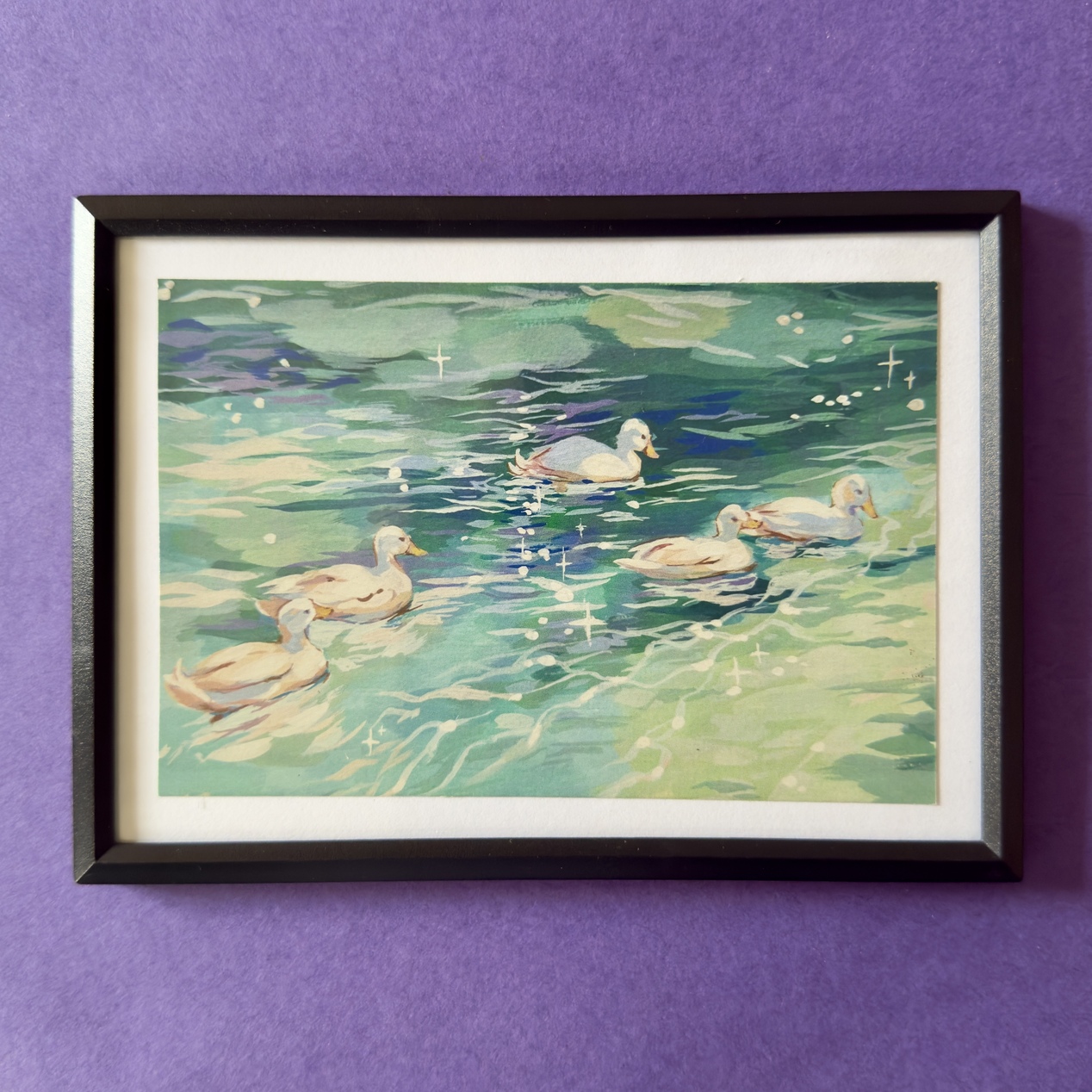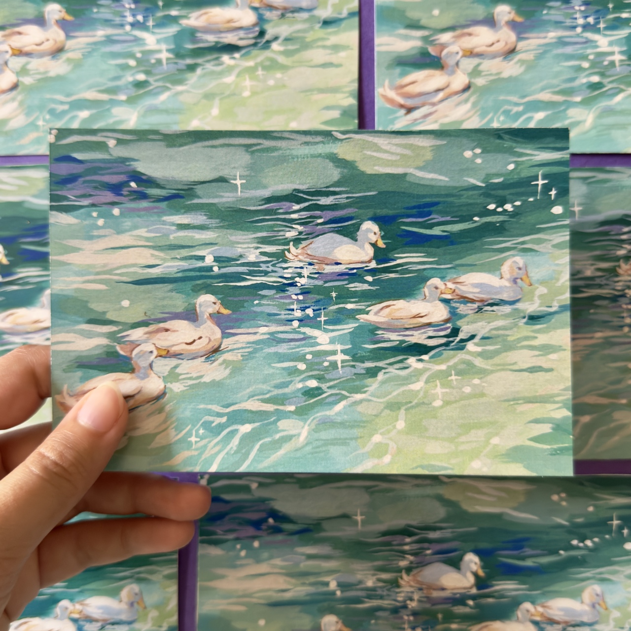 A gentle moment caught in stillness , a dreamy lake with ducks drifting across soft waters.
